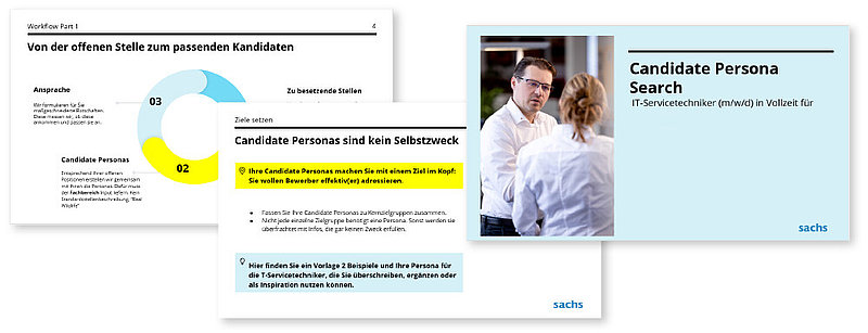 Fiktive Personen, die stellvertretend für Ihre Zielgruppe stehen. In diesem Fall: Bewerber:innen bzw. Talente. Ihnen werden fachliche und persönliche Eigenschaften zugeschrieben.